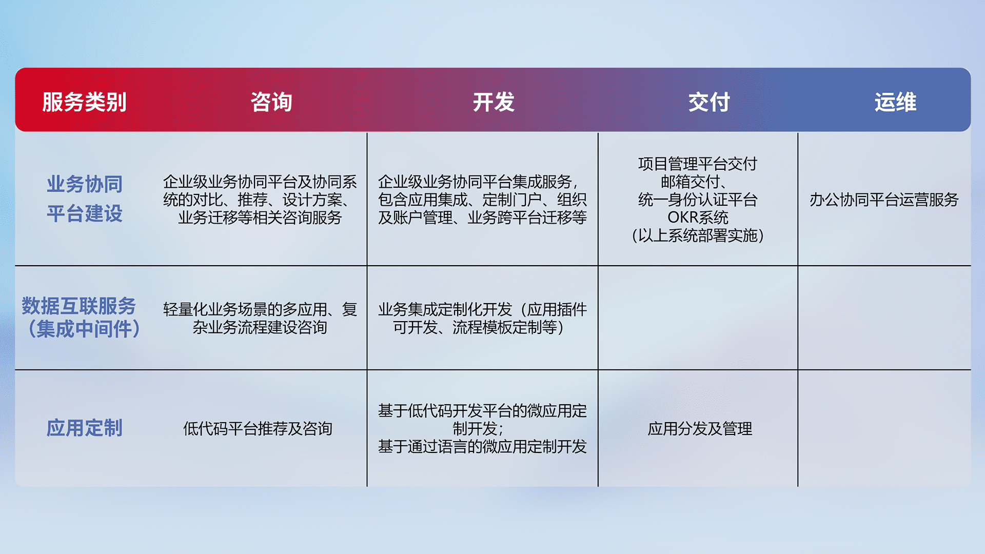 针对钉钉、、企微、、、IDaas等平台级产品提供产品的规划、、、方案、、交付、、、、定制化开发等服务,,,,实现如统一协同办公、、智能客户服务、、混合会议管理、、智能数据查询、、等业务场景,,,,实现数字化转型。。。